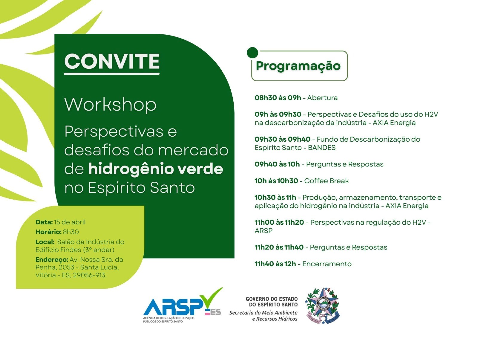 A Secretaria do Meio Ambiente e Recursos Hídricos (Seama), em parceria com a Agência de Regulação de Serviços Públicos do Espírito Santo (Arsp) e a Axia Energia, promove, no próximo dia 15 de abril, o workshop “Perspectivas e desafios do mercado de hidrogênio verde no Espírito Santo”. O encontro será realizado às 8h30, no Salão da Indústria, no edifício Findes, em Vitória.