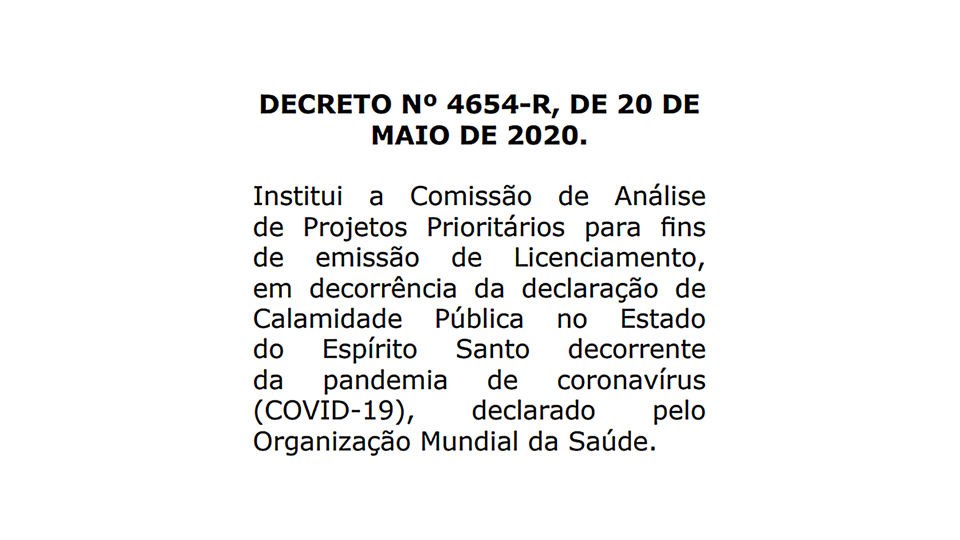 O Governo do Estado do Espírito Santo criou a “Comissão de Análise de Projetos Prioritários de Licenciamento Ambiental” para declarar como prioritários os projetos de incentivo e estímulo ao desenvolvimento econômico. A Comissão será temporária e funcionará até 31 de dezembro de 2021. O decreto Nº 4.654-R foi publicado, nesta quinta-feira (21), no Diário Oficial do Estado.