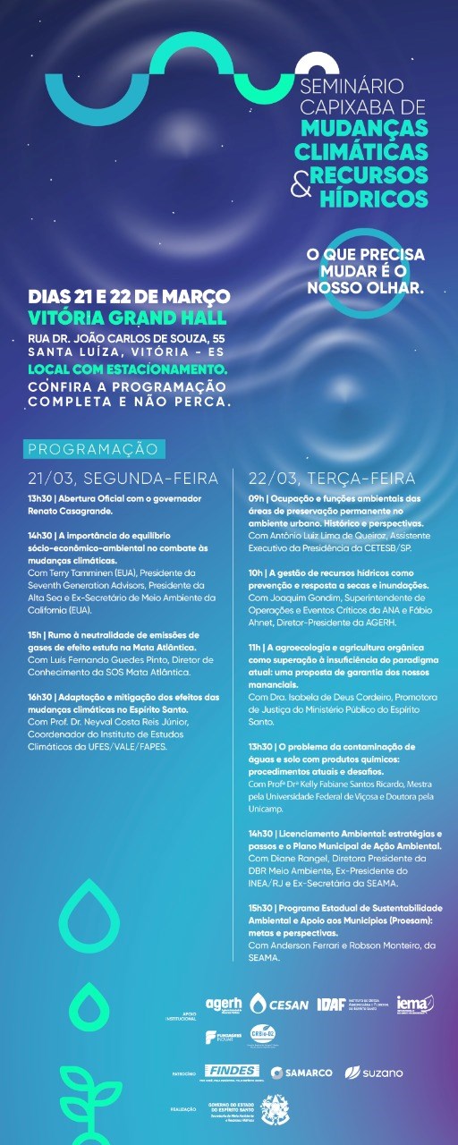 O evento será realizado no cerimonial Vitória Grand Hall, no Barro Vermelho, em Vitória, e reunirá especialistas em meio ambiente do Espírito Santo, do Brasil e do mundo para discutir soluções de combate às mudanças climáticas e preservação dos recursos hídricos em nosso Estado e em todo o planeta.