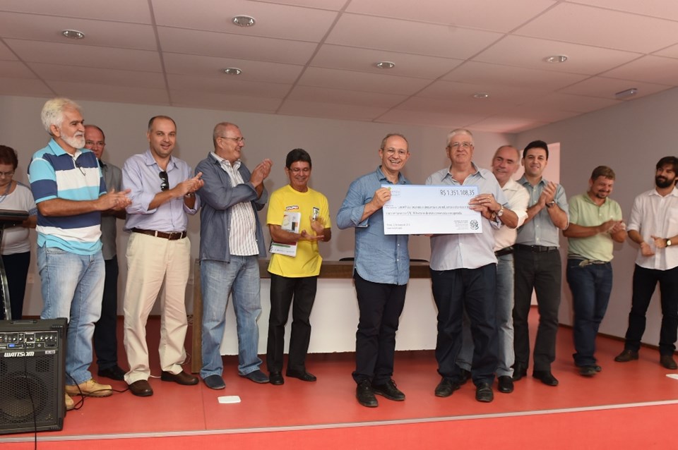 Quem recebeu o cheque simbólico homenageando todos os 50 produtores atendidos em 2015 pelo Reflorestar na Bacia do Benevente foi o produtor Ricardo Sardi, que subiu ao palco acompanhado de seu neto.
